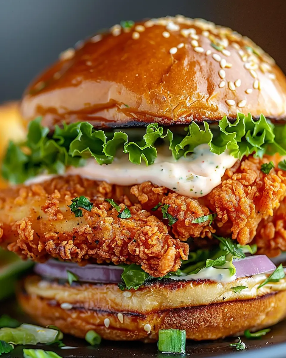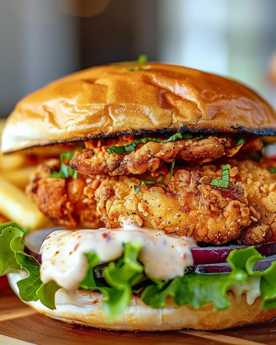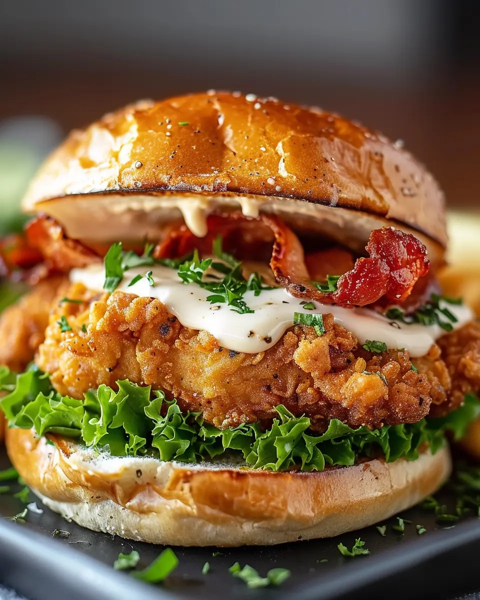 To assemble, spread a generous layer of garlic aioli on both sides of the bun. Then layer with crispy chicken, the turkey bacon, lettuce, tomato, and onion. Top it off with the other half of the bun, and trust me—this sandwich will be a hearty, flavorful delight that you won’t forget!
