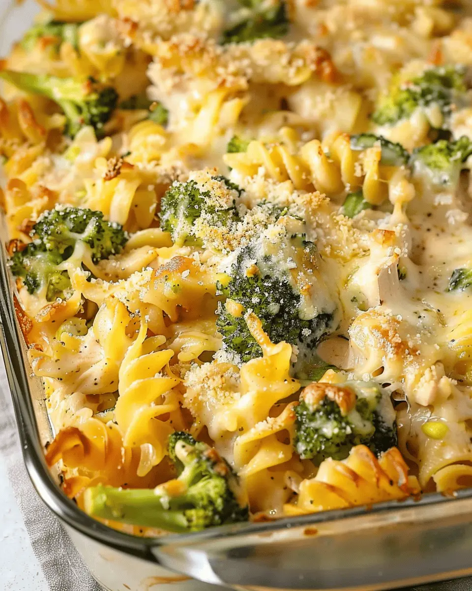 A delightful and creamy dish packed with chicken, broccoli, and pasta, perfect for family dinners.