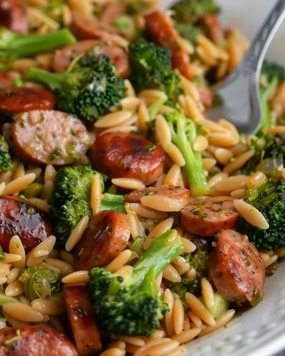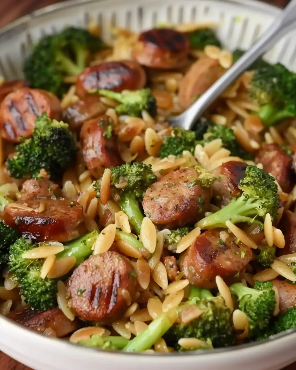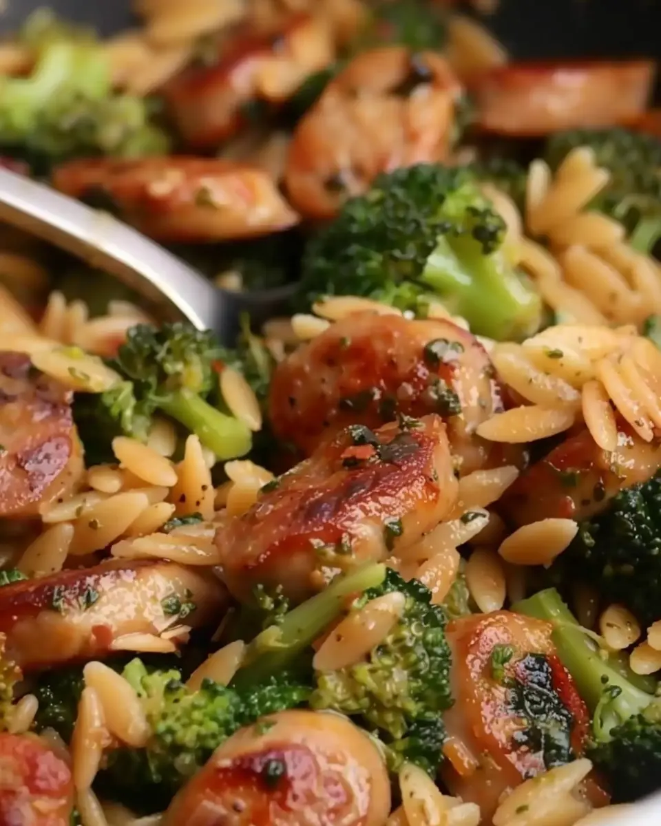 A delicious and easy-to-make dish featuring chicken sausage and vibrant broccoli mixed with orzo pasta.