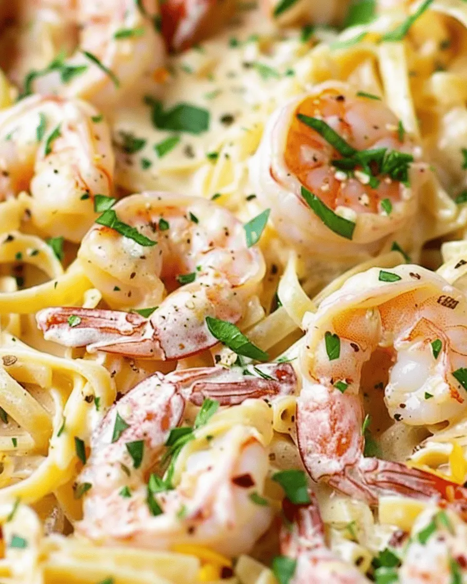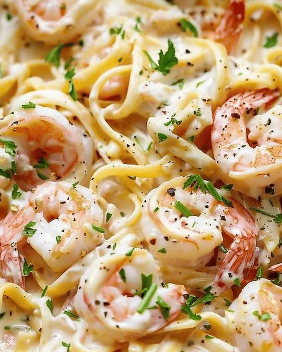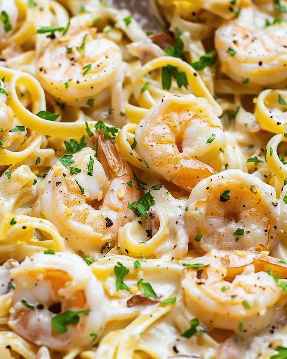 PrintCreamy Shrimp Pasta: Indulgent Shrimp Alfredo with Turkey Bacon