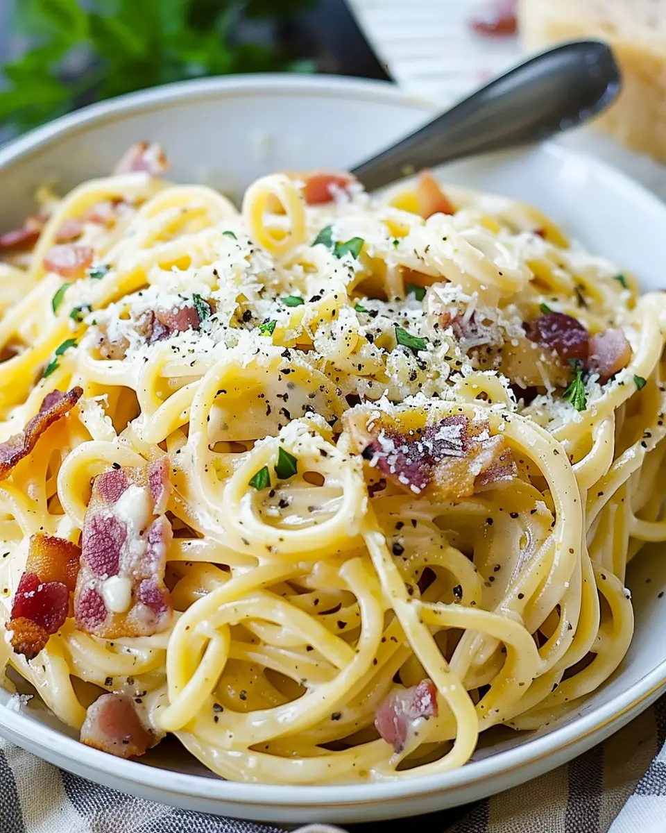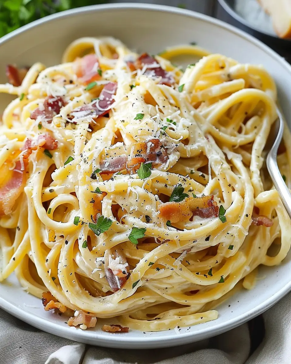 Indulge in a creamy, delicious turkey bacon carbonara pasta that brings restaurant-quality comfort food right into your kitchen.