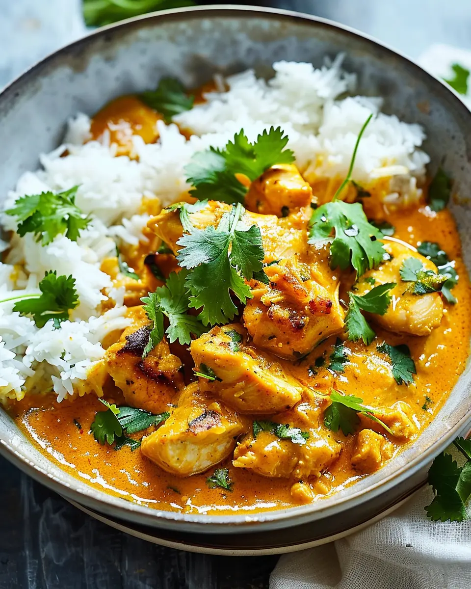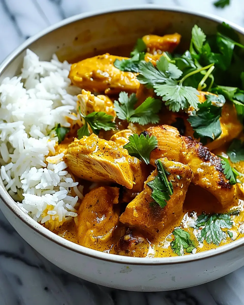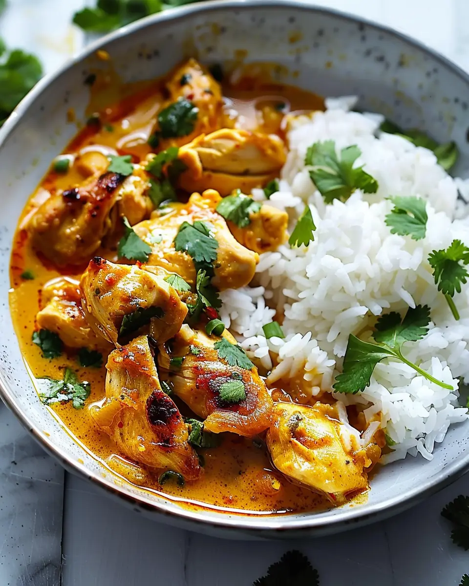 Make your plate pop: serve the Dinner Savory Curried Coconut Chicken & Rice in a vibrant bowl. Arrange the chicken over the rice attractively and drizzle with coconut milk for a creamy finish. A dash of paprika or chili flakes can give it an enticing, colorful touch. Remember, we eat with our eyes first, so take a moment to make it look as delicious as it tastes!