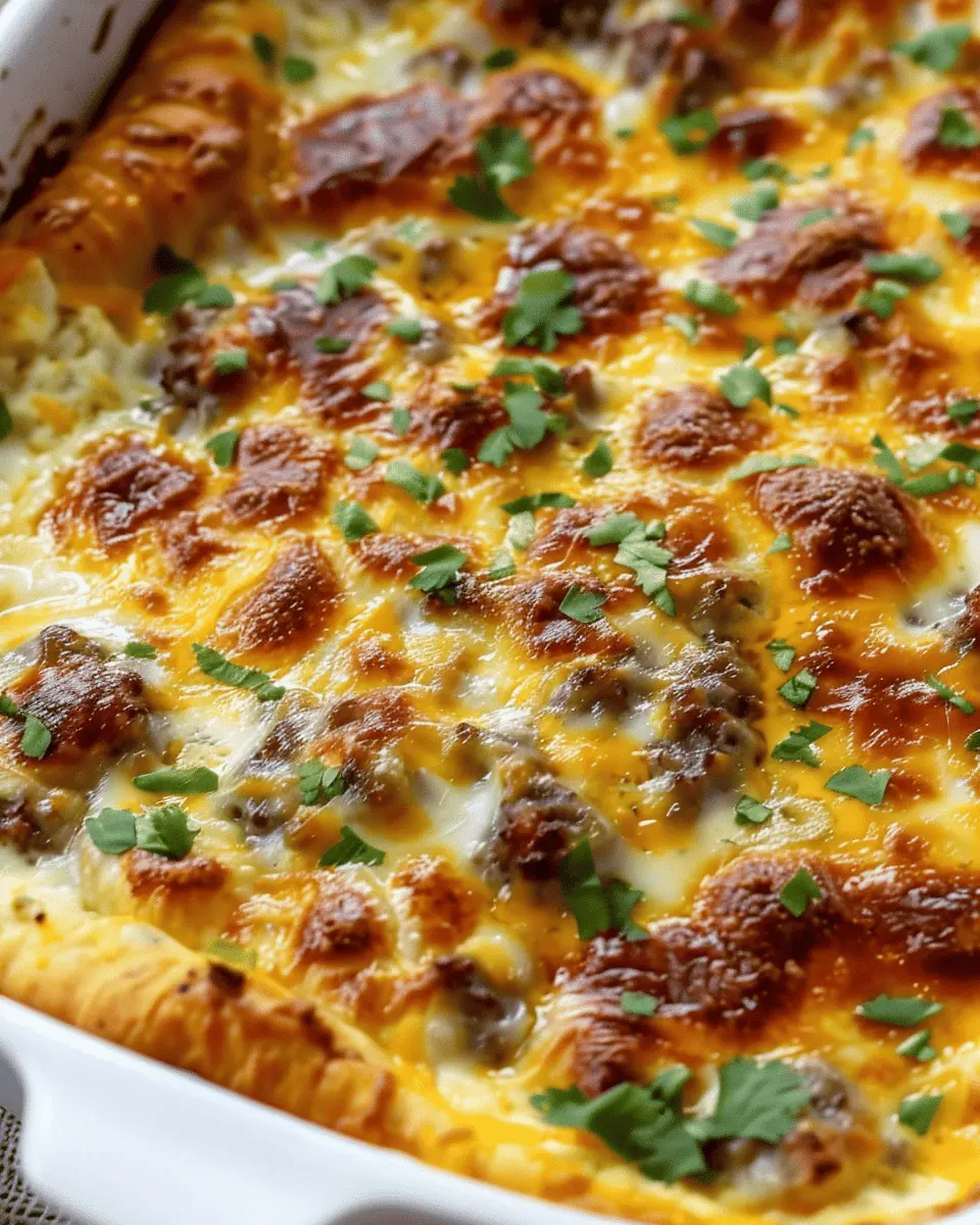 Once the crescent rolls are in place, it’s time to layer in the cooked sausage (and onion, if you added it). Evenly distribute the sausage mixture over the rolls, ensuring every bite will be full of flavor. What’s great about this casserole is its versatility; you can also mix in some chopped bell peppers or even spinach for a vegetable boost.