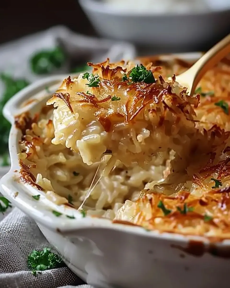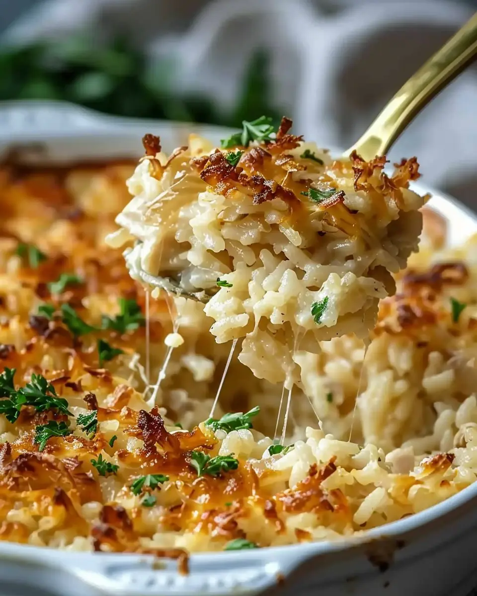 The French Onion Chicken Rice Bake is the epitome of comfort food, combining the rich flavors of caramelized onions and savory herbs with tender chicken and fluffy rice. It’s not just a meal; it’s an experience that brings everyone around the table, creating warmth and connection. The creamy texture and the crunchy topping make each bite delightful, appealing to both kids and adults alike.