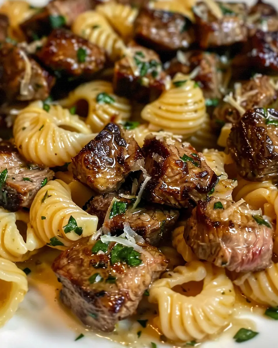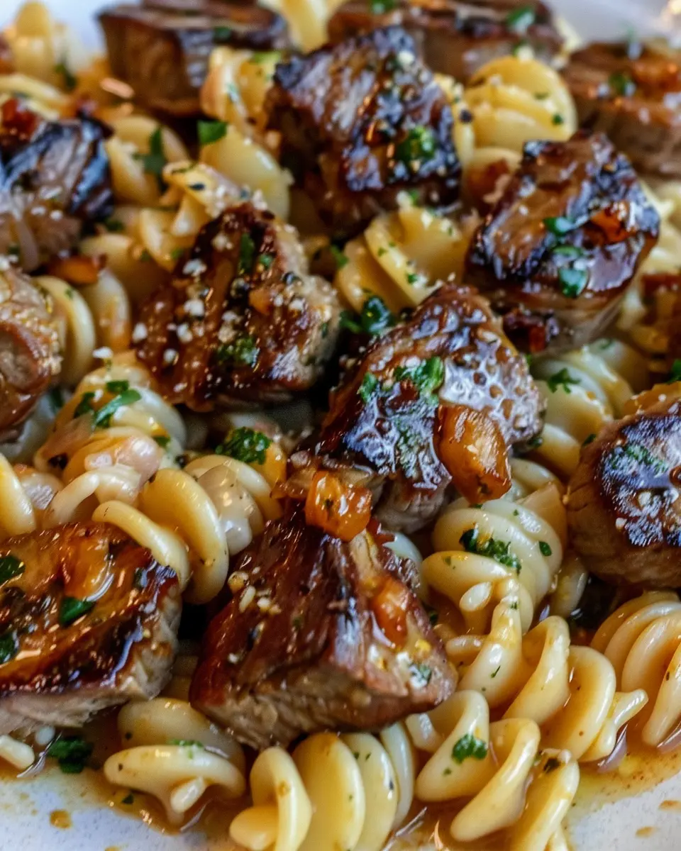 - Return the seared steak bites to the skillet and toss them with the pasta and garlic butter sauce.