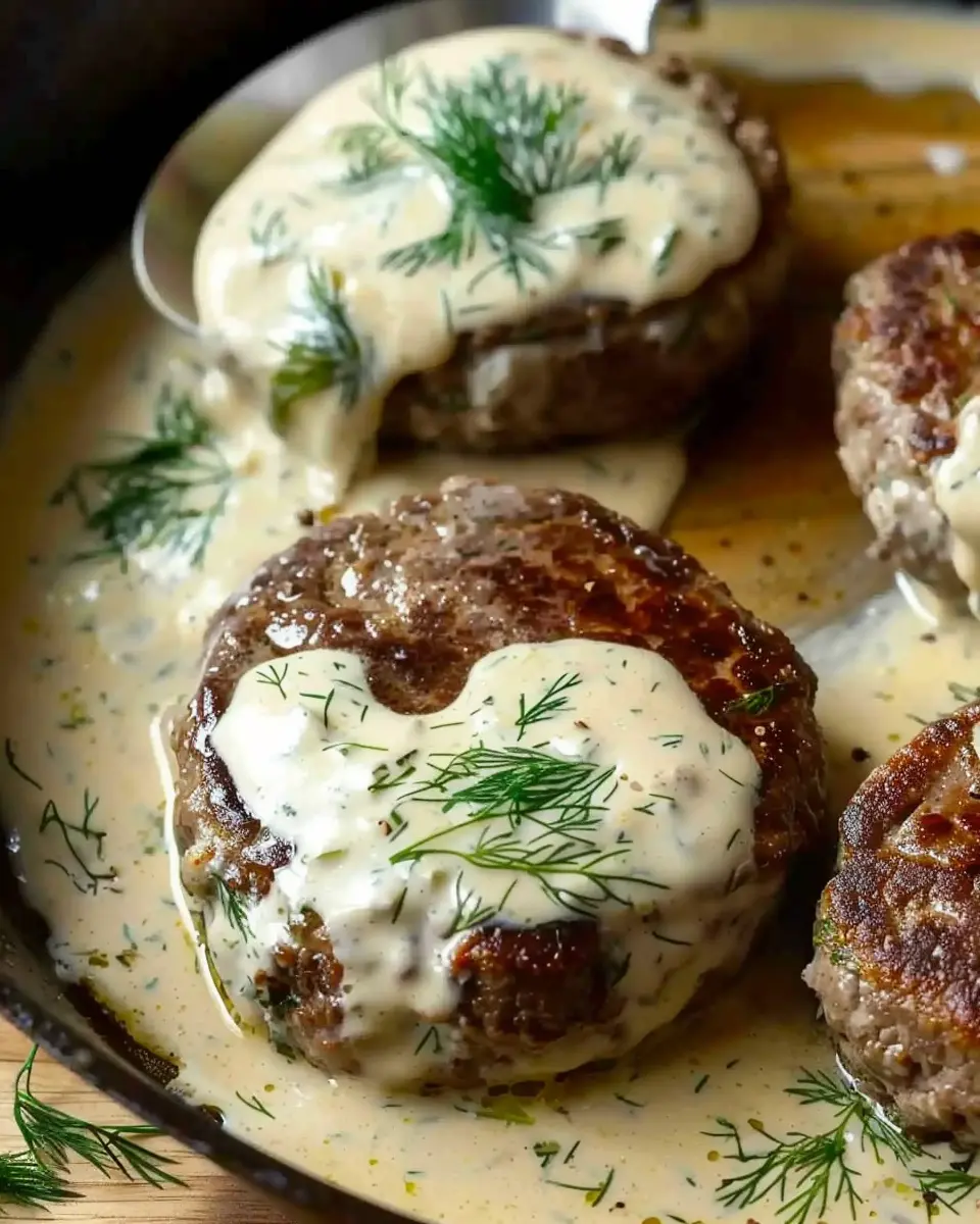 A comforting and delicious dish featuring juicy hamburger steaks smothered in a creamy dill sauce.