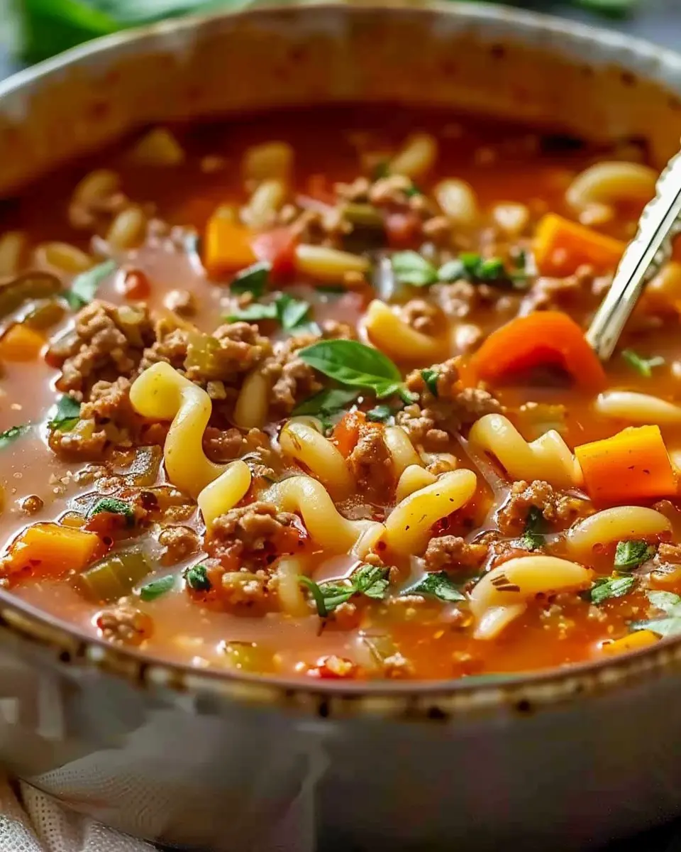 A warm and hearty soup made with ground beef and pasta, perfect for weeknight dinners.