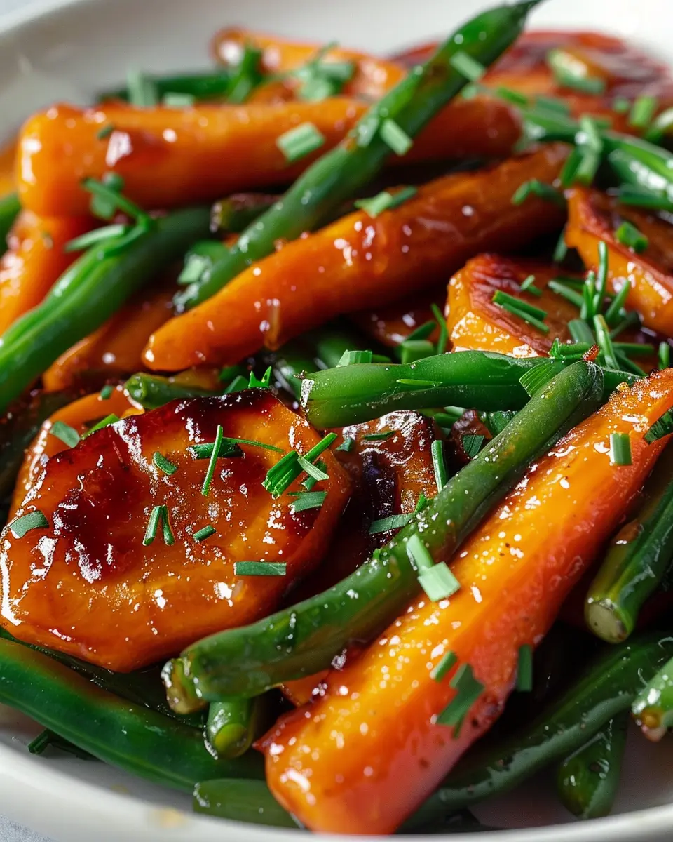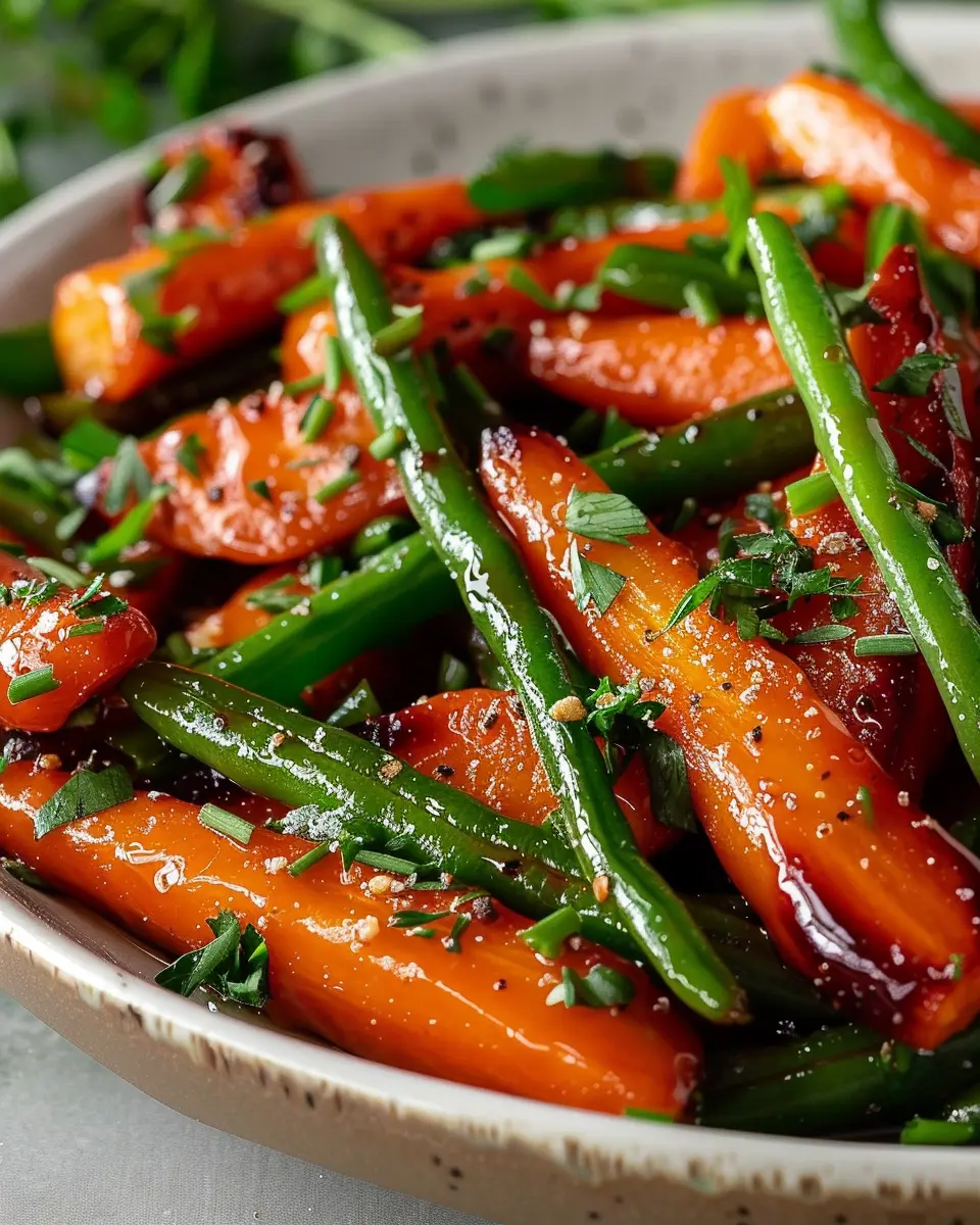A delicious side dish featuring honey glazed carrots and green beans with the delightful flavor of turkey bacon.