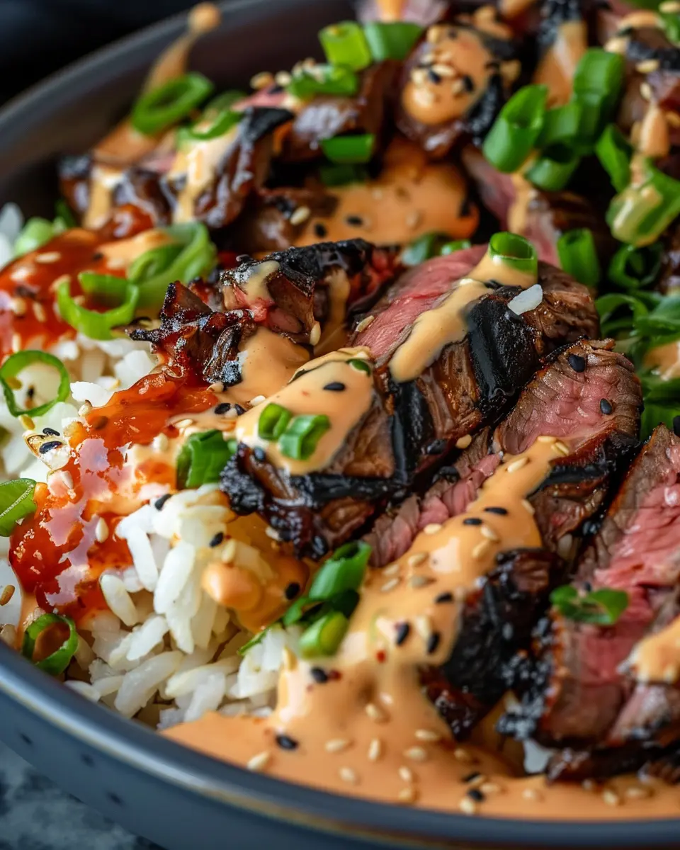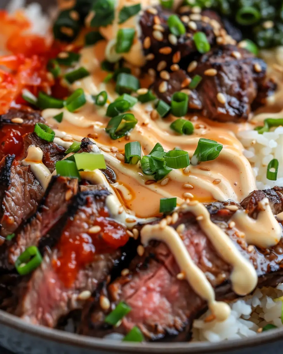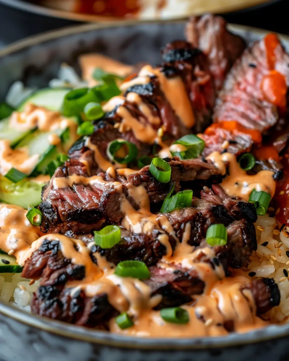 Start by placing a generous scoop of rice in your bowl, then arrange sliced steak on top. Drizzle that spicy cream sauce over everything and finish with your veggies and a sprinkle of sesame seeds.