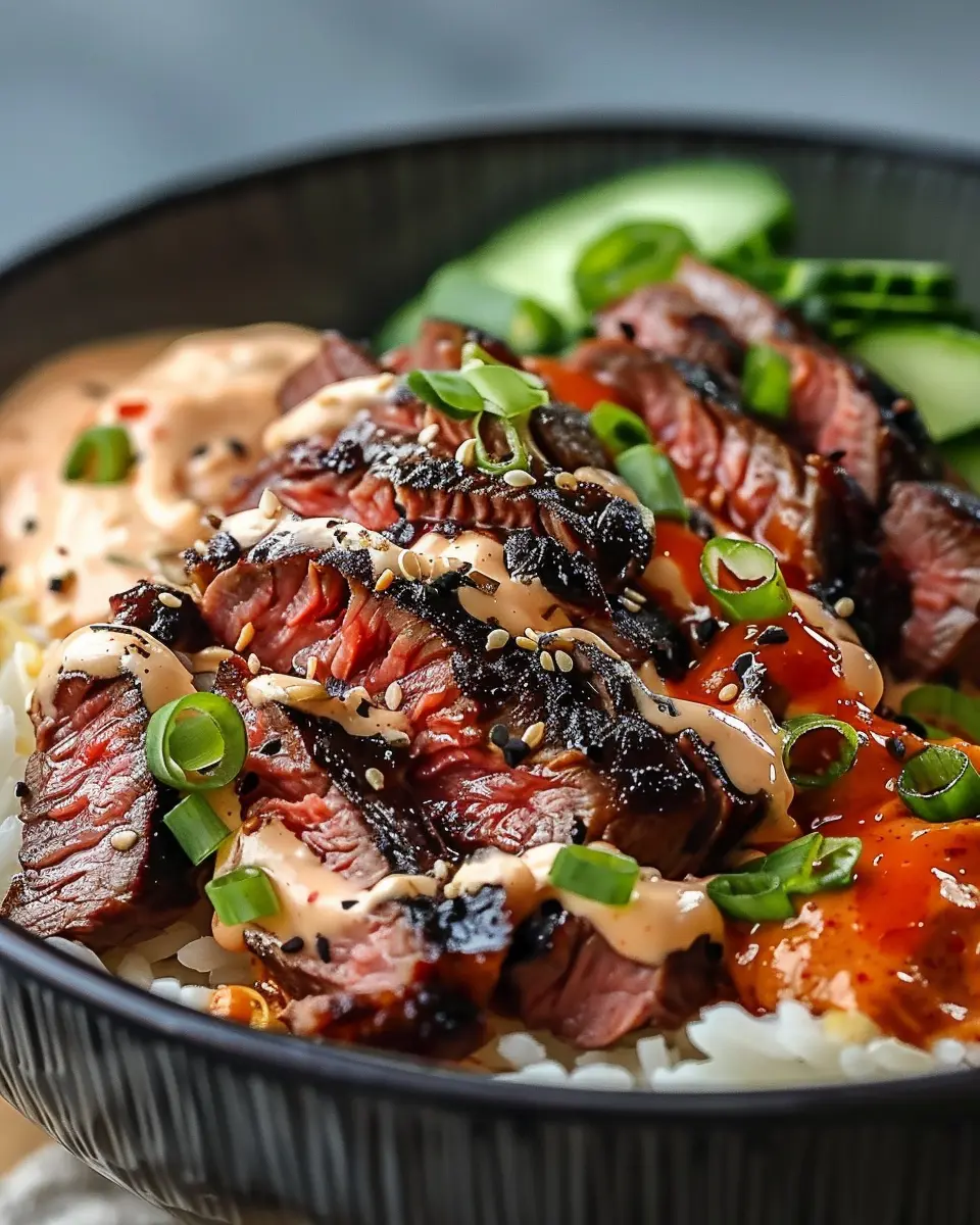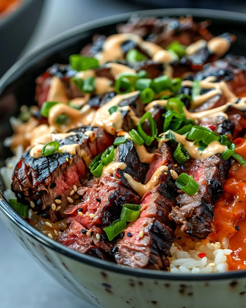 Korean BBQ Steak Rice Bowls with Spicy Cream Sauce: A Flavorful Delight