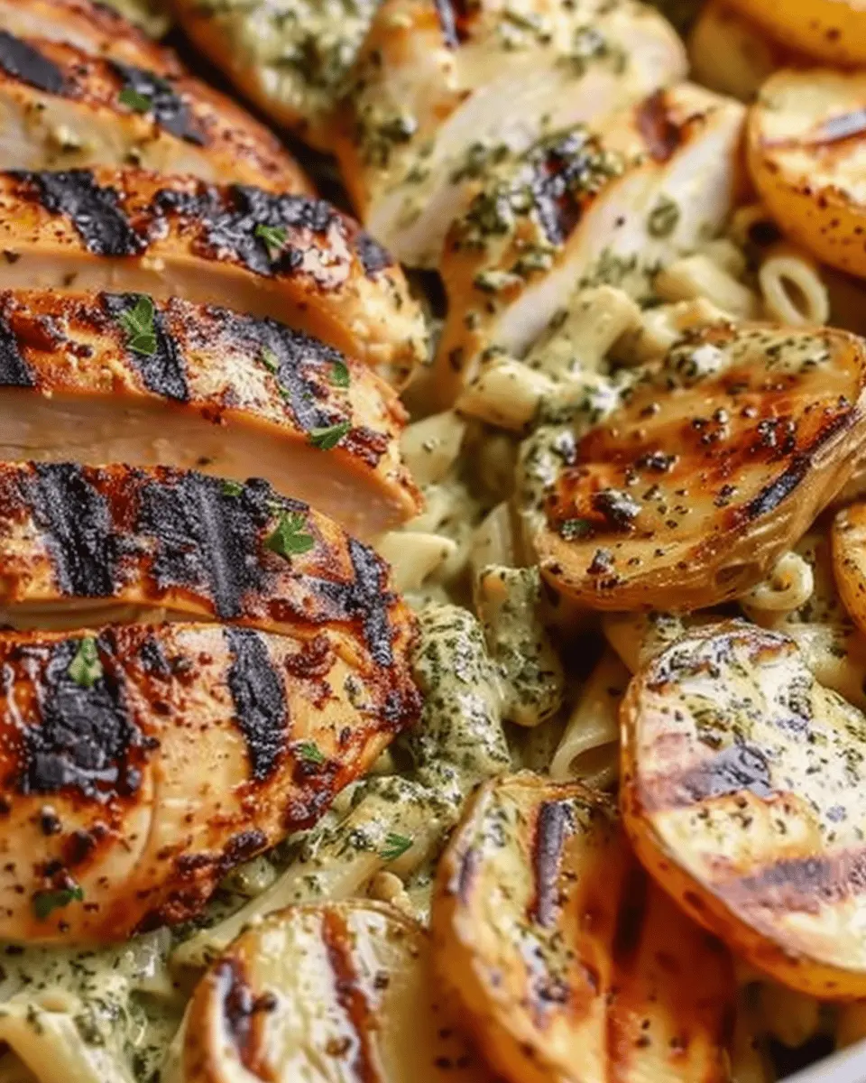 Loaded Herb Grilled Chicken: Indulgent Creamy Pesto Pasta & Roasted Potatoes
