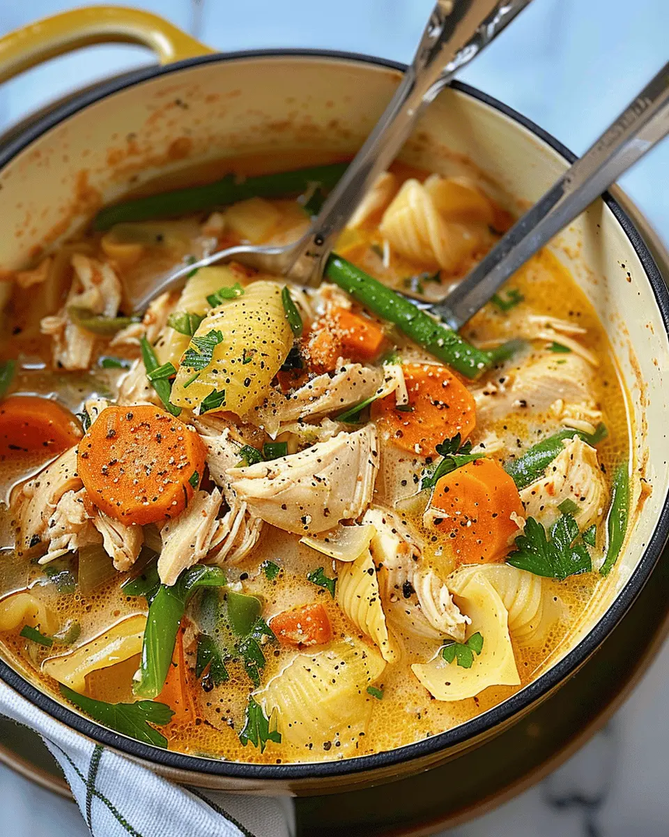Pour in the chicken broth, bringing everything to a gentle simmer. Add your cooked chicken back to the pot along with the dried herbs, salt, and pepper. You can also add your choice of pasta—cooked al dente if you prefer a heartier texture or uncooked if you want it to soak up the flavors. Let the soup simmer for around 15–20 minutes so all the flavors meld beautifully.