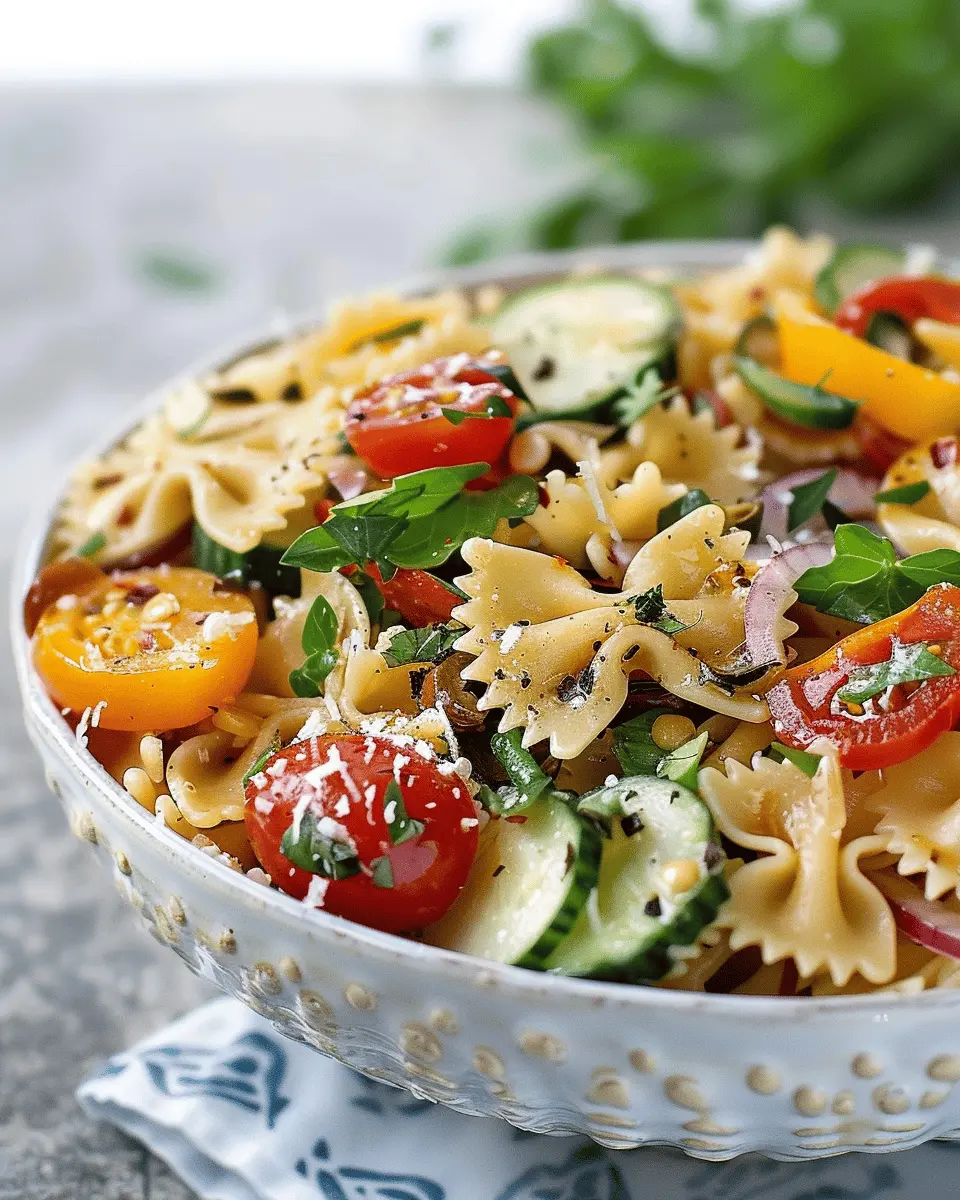 In conclusion, Mediterranean Pasta Salad is not just a dish; it’s a culinary experience that’s as vibrant as it is nutritious. This salad strikes the perfect balance between hearty and refreshing, making it an ideal choice for a quick lunch or a satisfying side at your next gathering. With ingredients like colorful bell peppers, olives, and feta cheese, you’re not only enjoying a flavorful bite but also a variety of textures and nutrients.