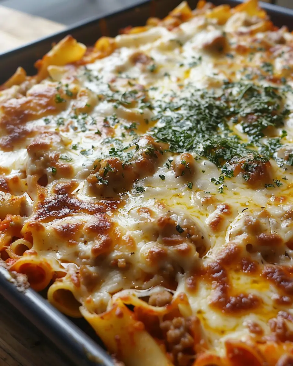 Now that everything is prepped, it’s time to assemble our baked ziti masterpiece! Start by preheating your oven to 375°F (190°C). In a large baking dish, spread a thin layer of meat sauce at the bottom. Follow with a layer of ziti, then the cheesy filling, and some more meat sauce. Add another layer of pasta and finish off with the remaining meat sauce. Top generously with the rest of the mozzarella and Parmesan cheeses for that golden finish.