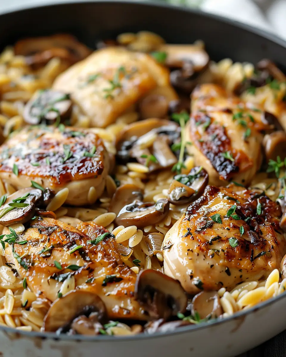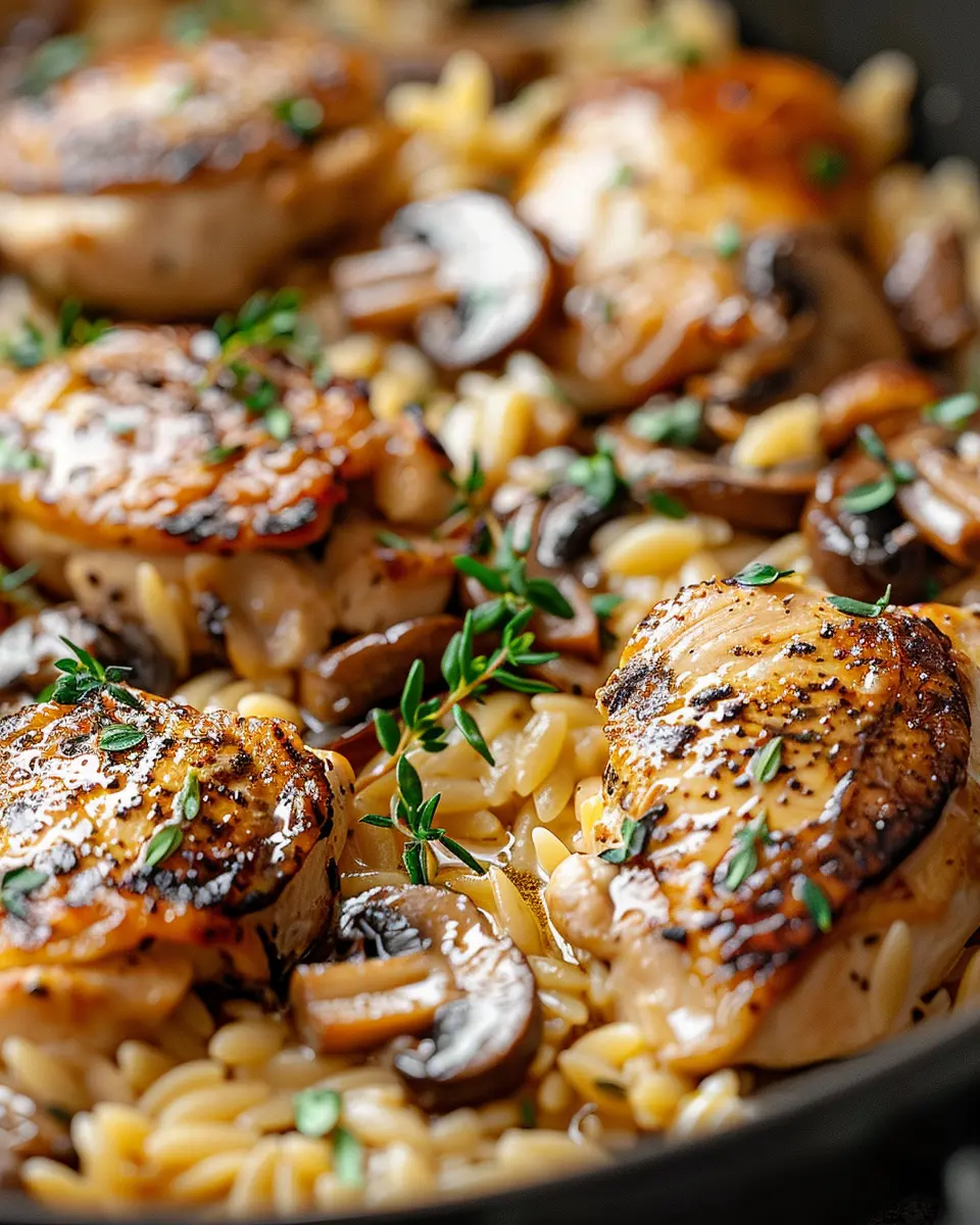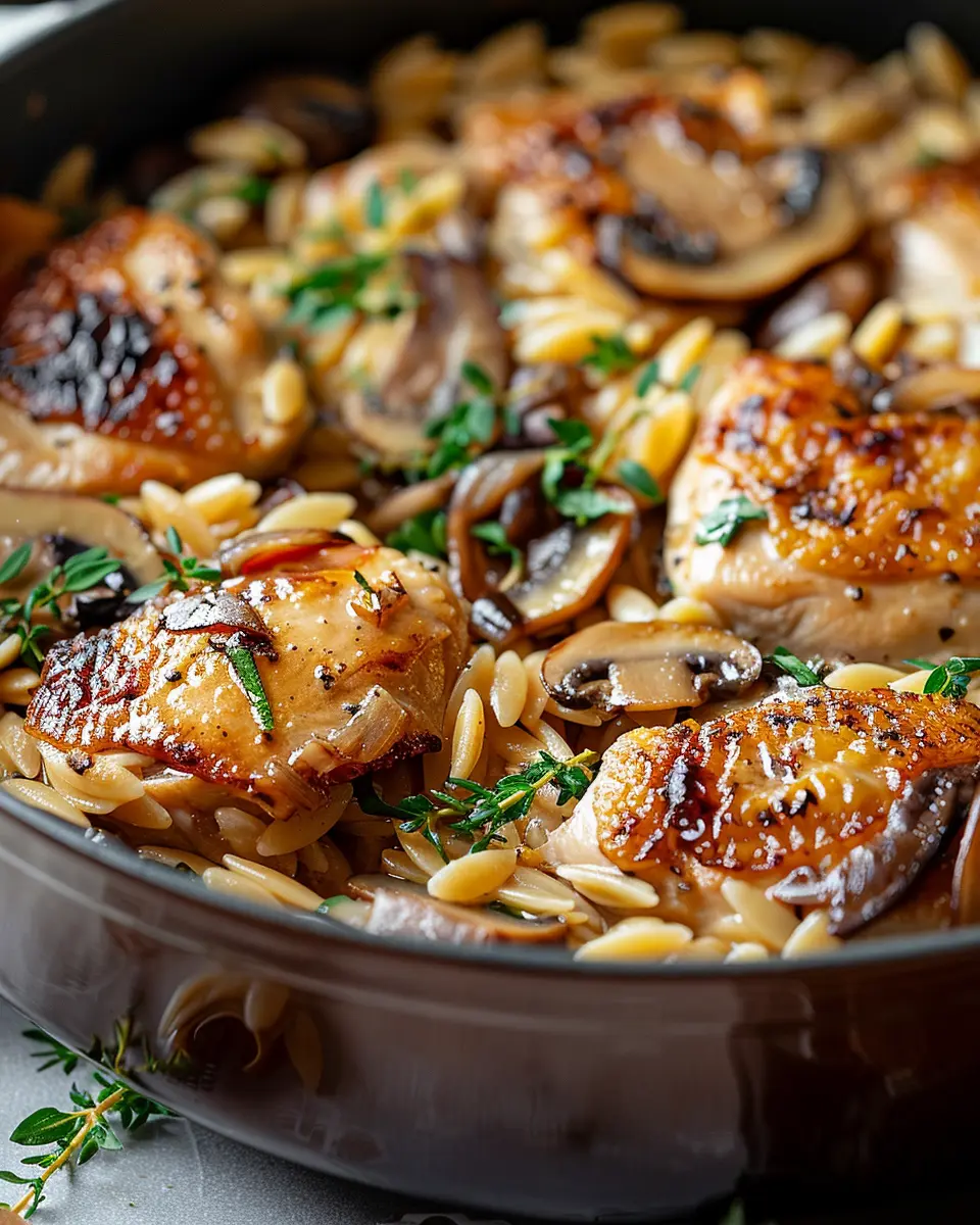 A delightful and easy one pot meal featuring tender chicken and earthy mushrooms combined with orzo for a comforting dish the whole family will love.