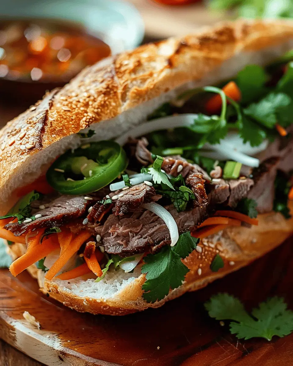 • Pickled Vegetables: Quick-pickled carrots and daikon radishes offer a tangy crunch, perfect for cutting through the richness of the beef.