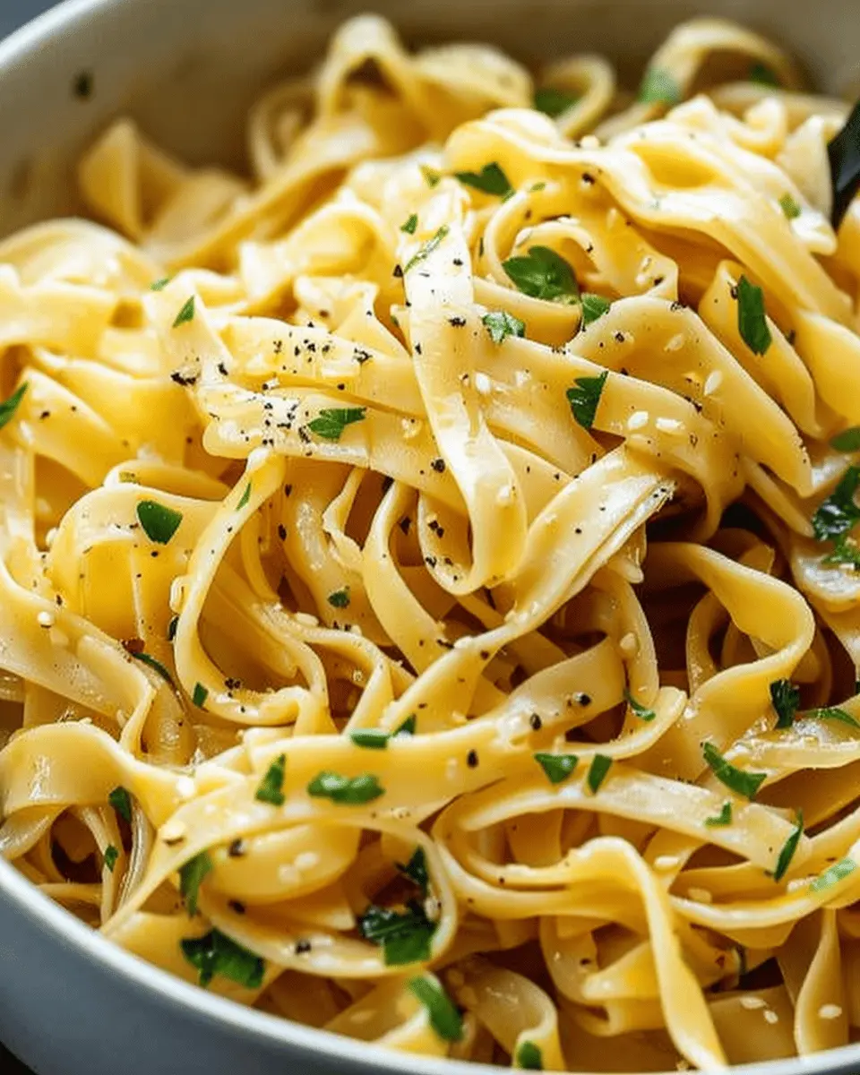 Your quick and easy garlic butter noodles are almost ready! Once everything is combined, remove the pan from the heat. Serve the noodles in bowls, and top with freshly chopped parsley and a generous sprinkle of grated Parmesan cheese.