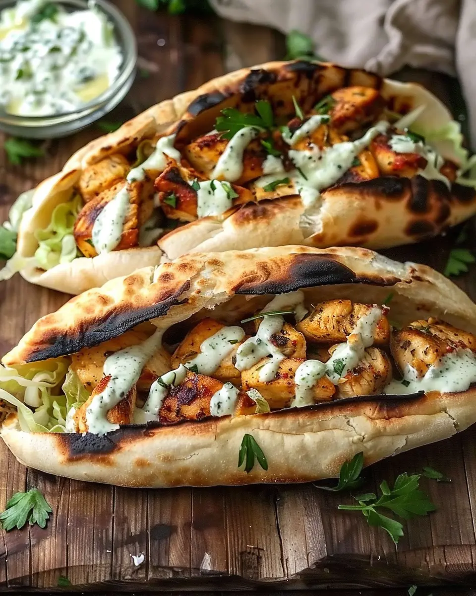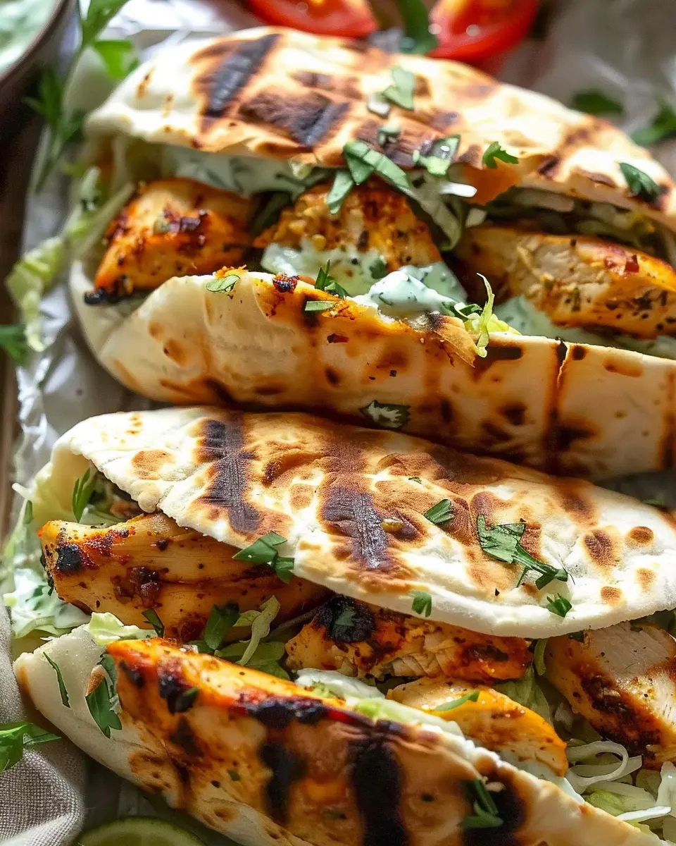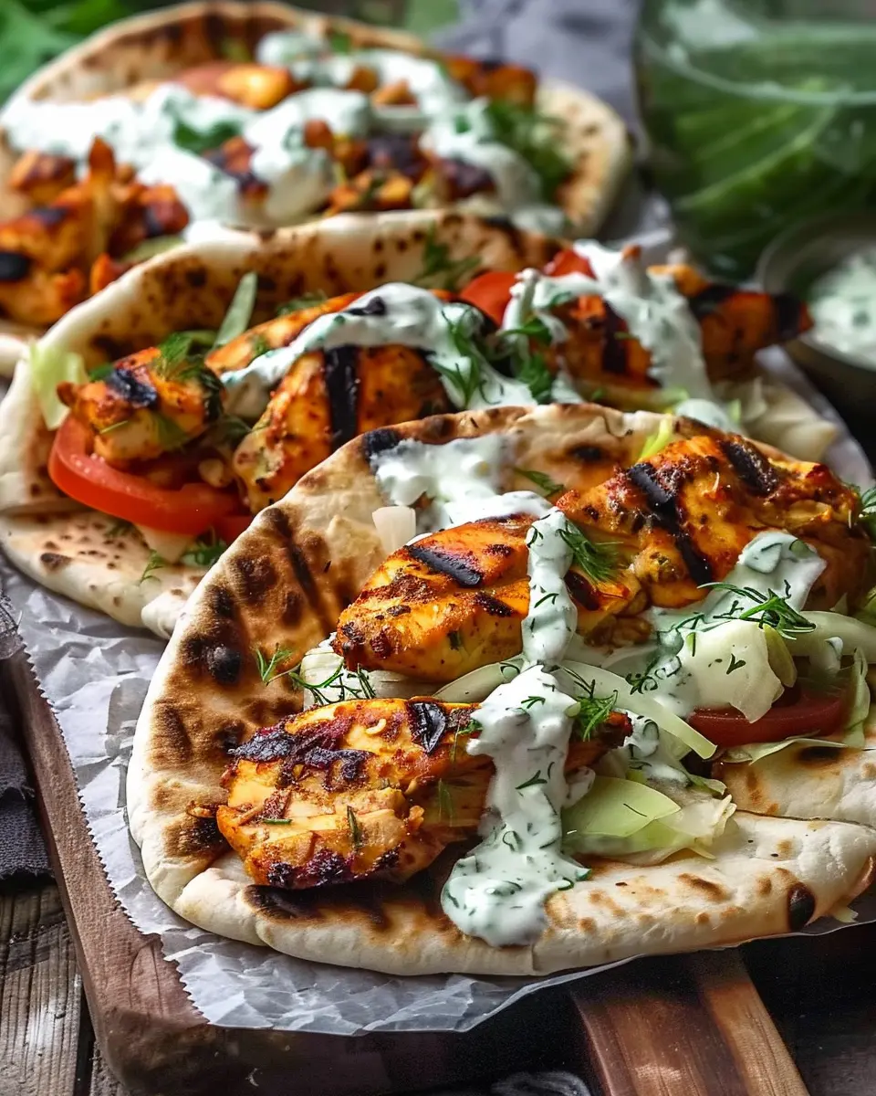 - Assemble the pitas by adding sliced chicken, mixed greens, tomatoes, and cucumbers.
