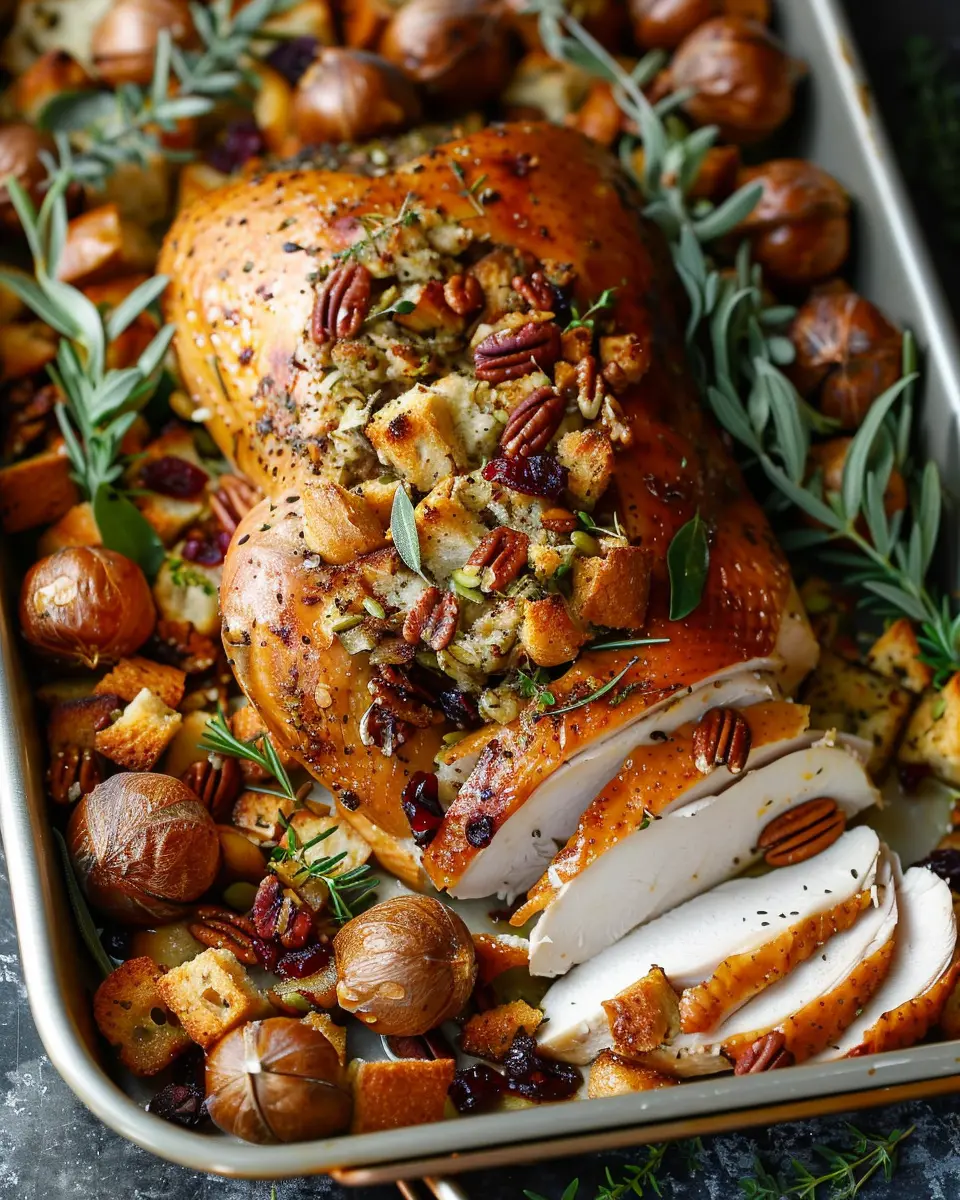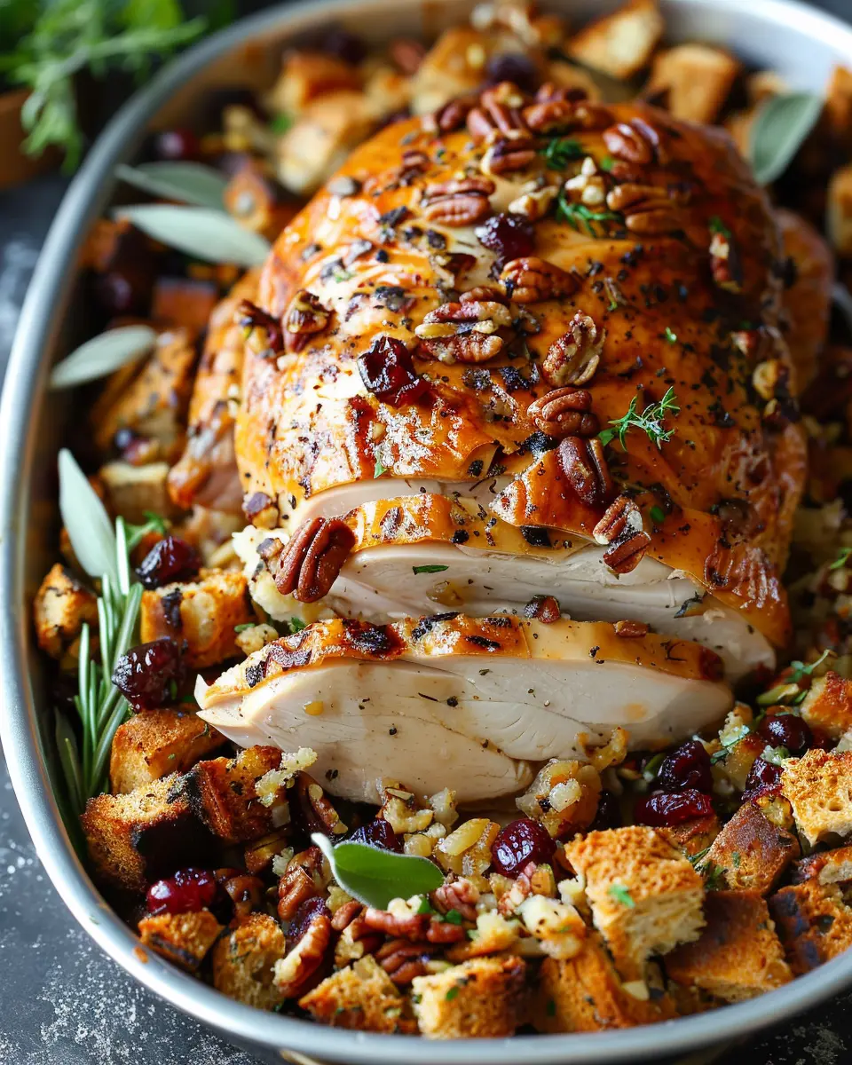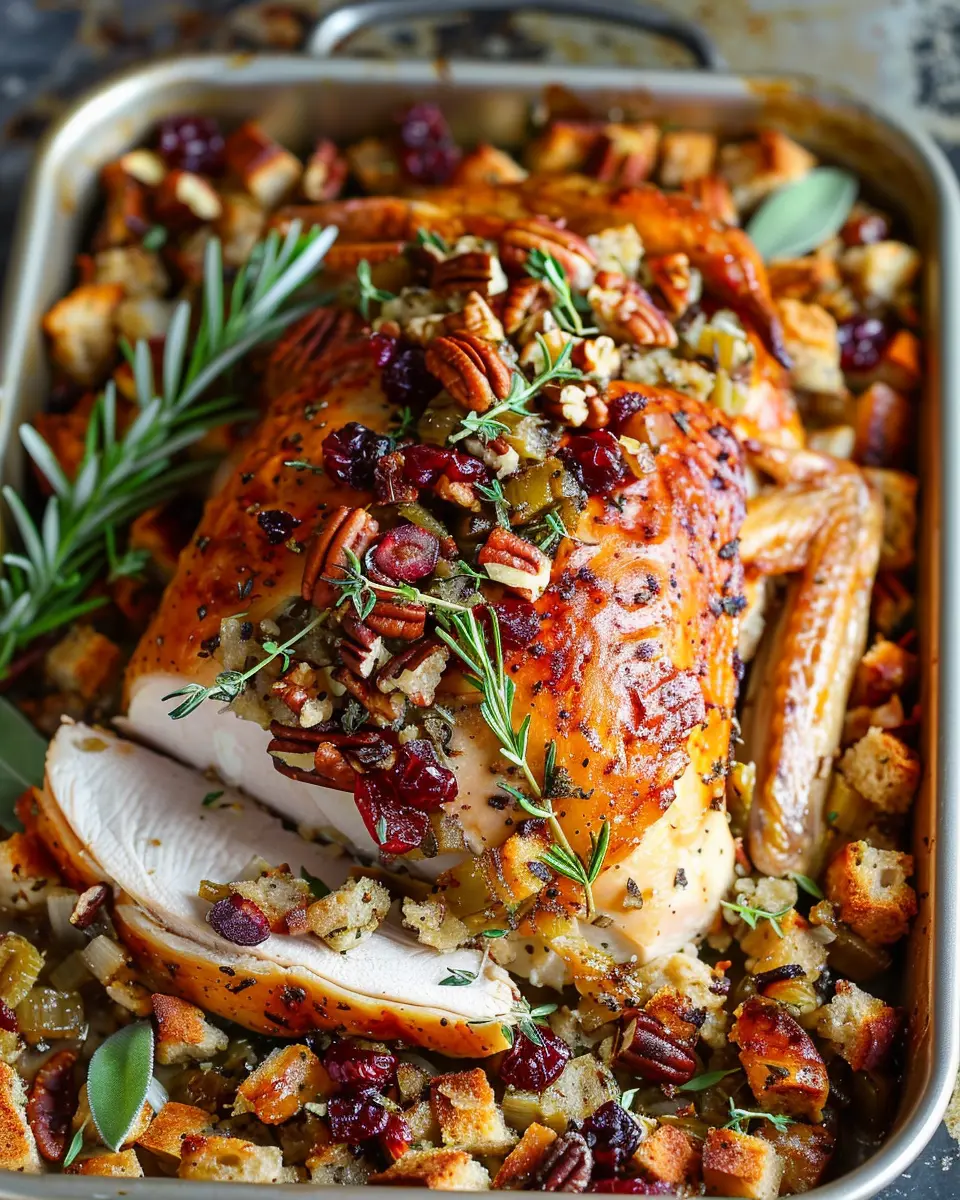 A delightful dish combining herb roasted turkey with a delicious cranberry pecan stuffing, perfect for any festive occasion.