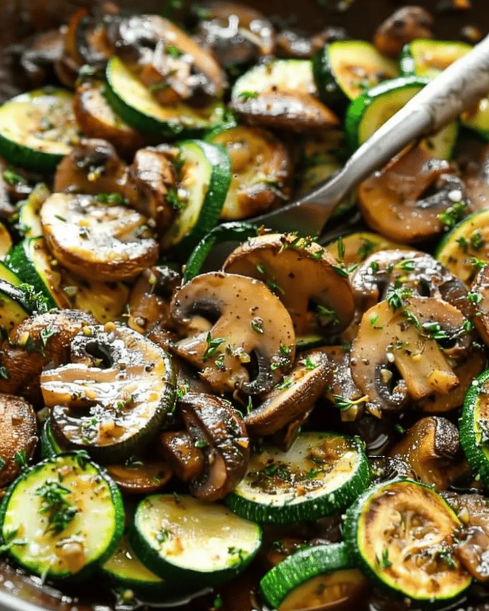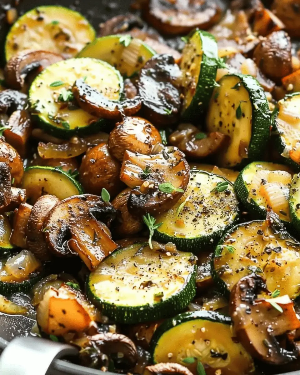 A delightful and easy dish featuring fresh zucchini and mushrooms cooked in a skillet for a quick meal.
