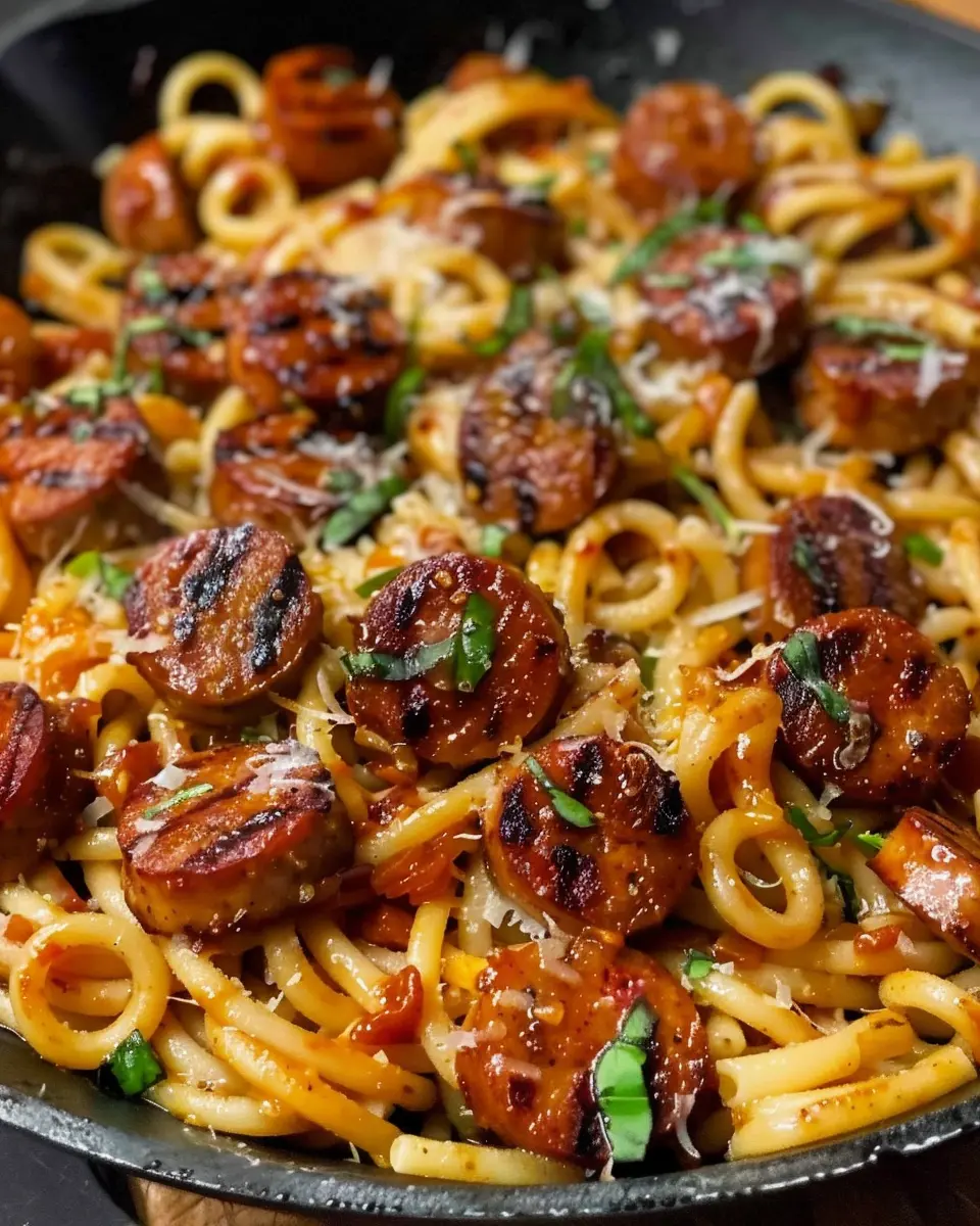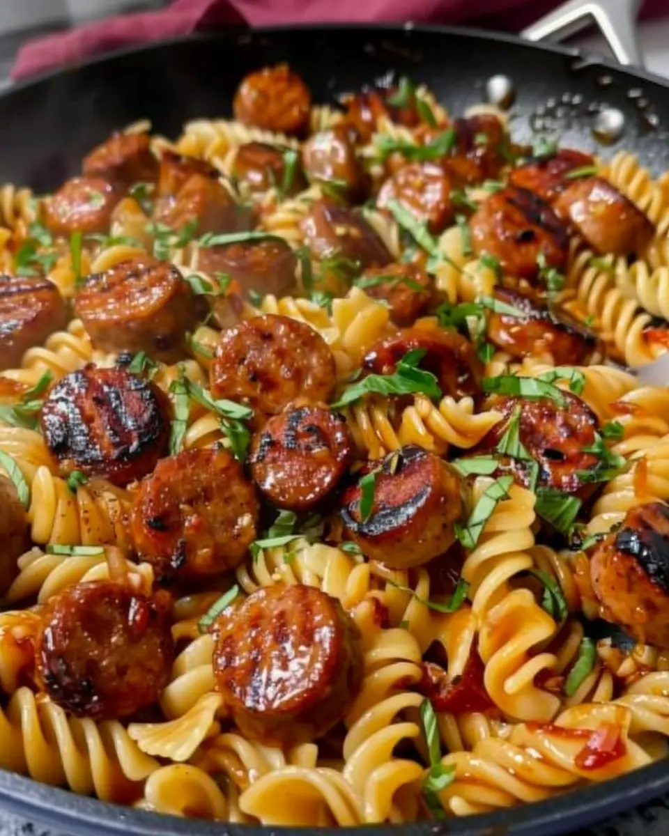 Step-by-Step Preparation of Sticky Honey Garlic Sausage Pasta Skillet
