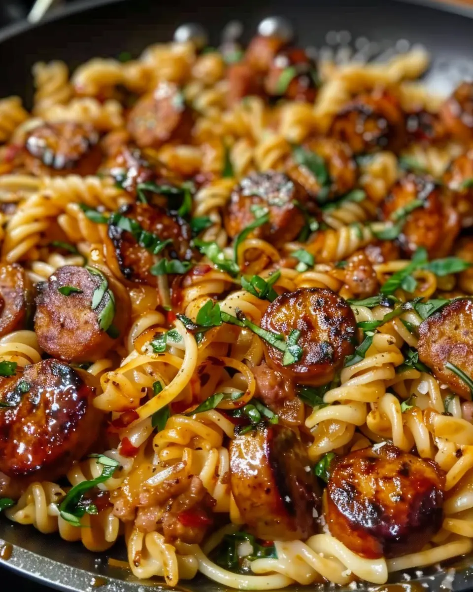 A delicious and easy-to-make pasta skillet dish featuring flavorful sausage and a sticky honey garlic sauce.