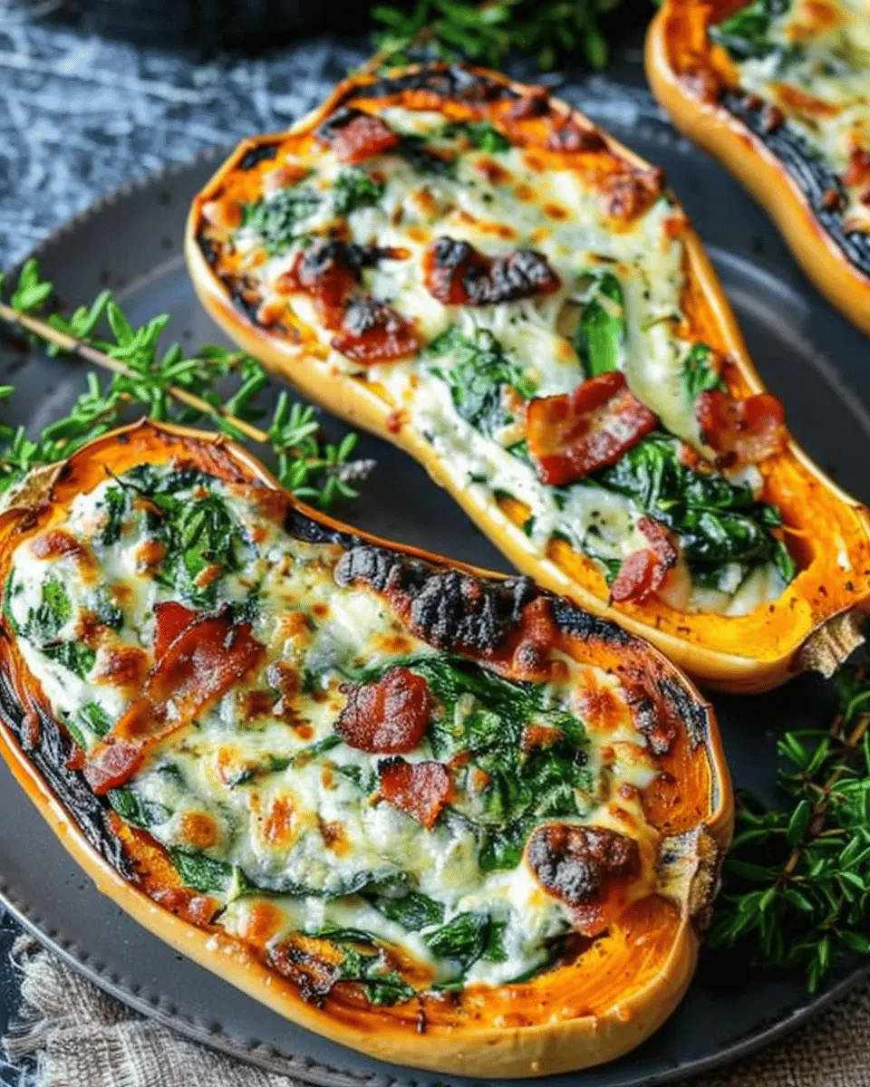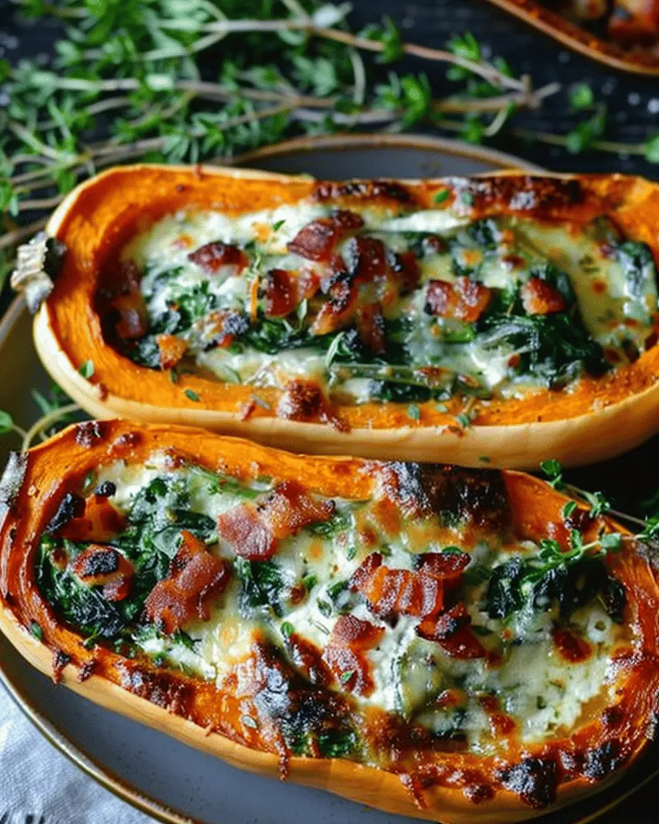 PrintStuffed Butternut Squash: Easy Spinach, Turkey Bacon, and Cheese Delight