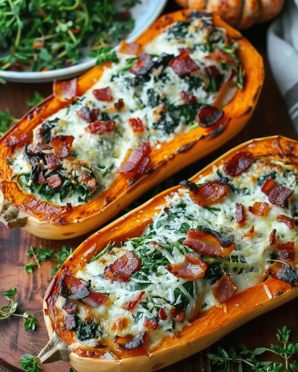 Stuffed butternut squash is a delightful dish that warms the heart and fills the belly. With its creamy spinach filling and savory turkey bacon, this recipe is perfect for any occasion—especially when you want something comforting but light. Let’s dive into the preparation steps to ensure you make the most out of this delicious meal!