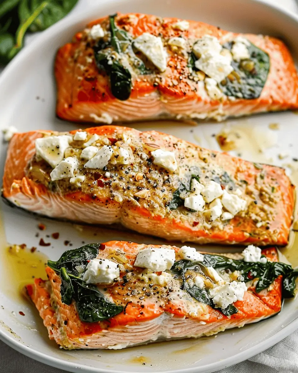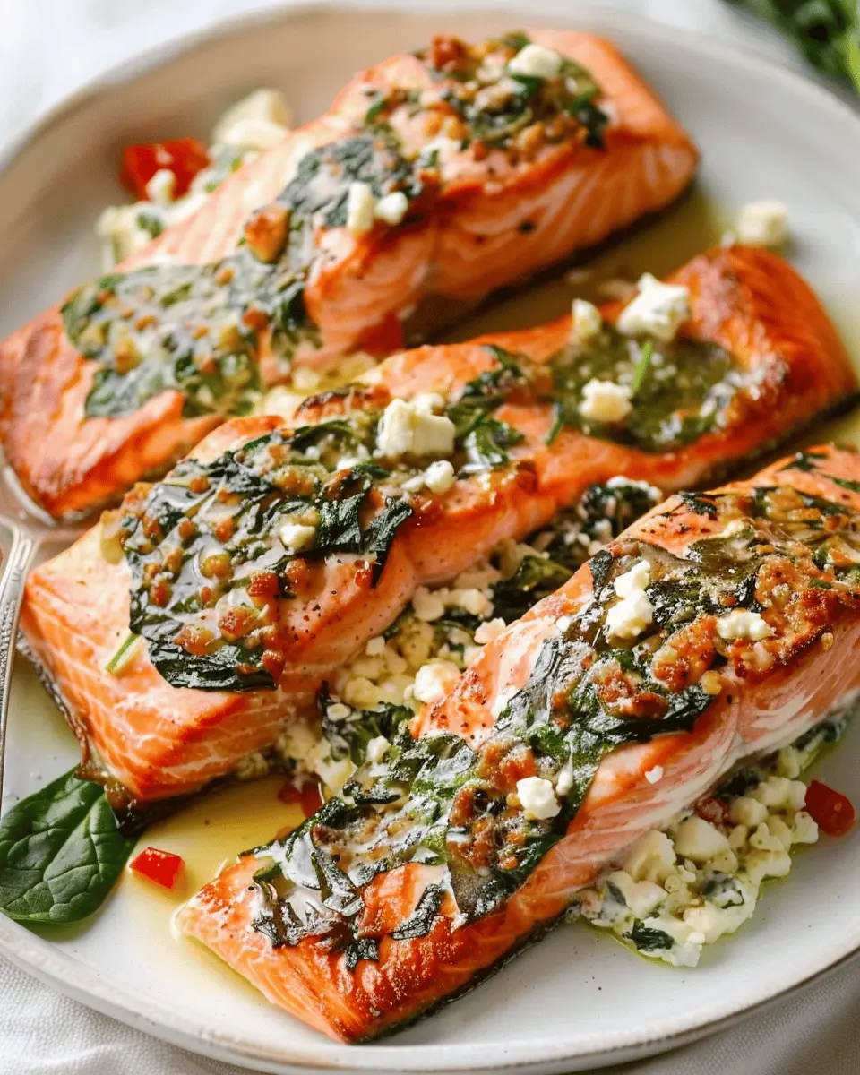 In summary, stuffed salmon with spinach and feta is a perfect blend of flavor, nutrition, and ease of preparation that fits perfectly into a busy lifestyle. The juicy salmon acts as a vessel for a delicious spinach and feta filling, creating a meal that’s vibrant and satisfying. Not only is it a quick weeknight dinner option, but it’s also impressive enough for entertaining guests.