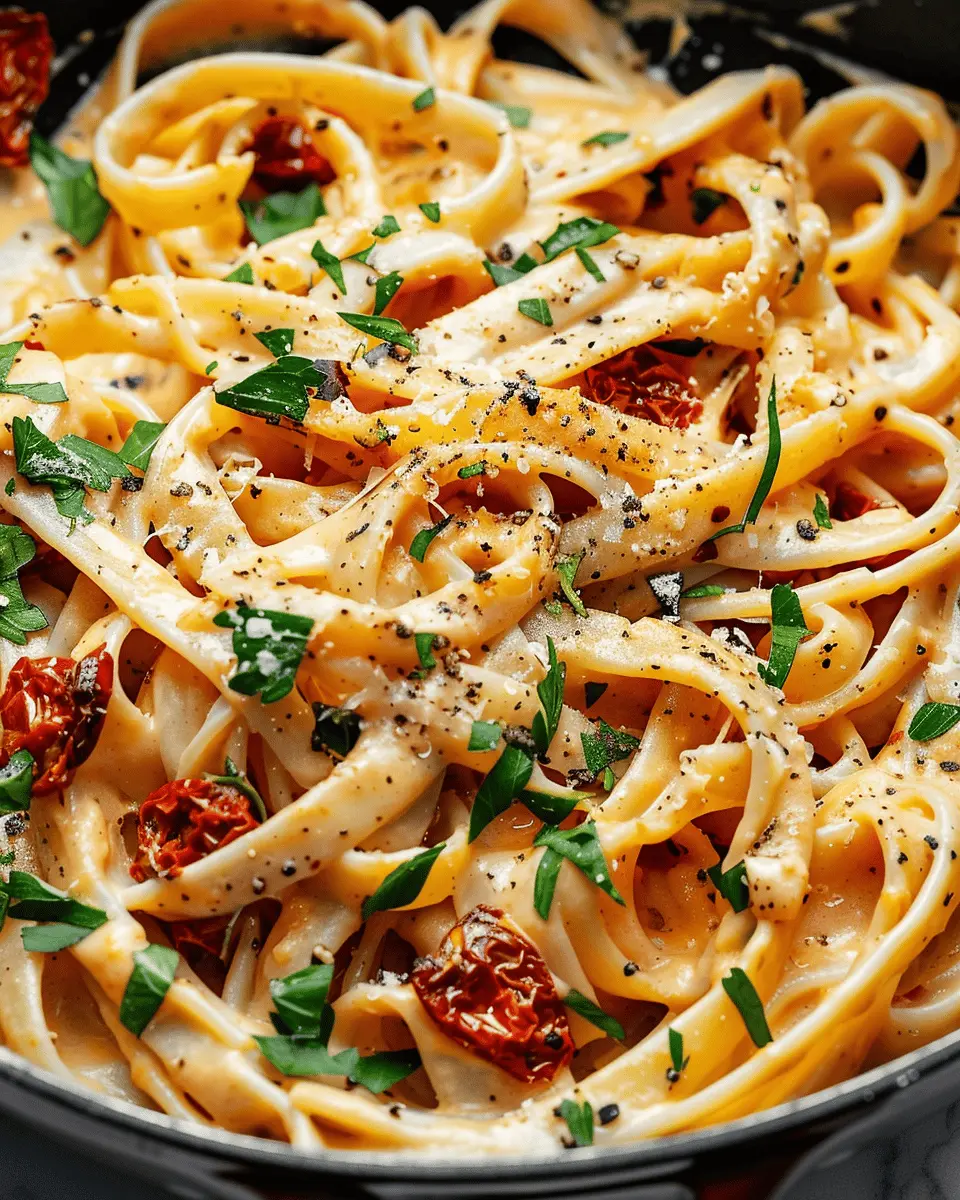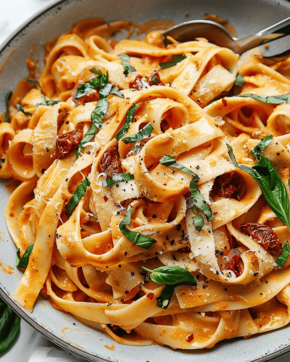 - Color Contrast: Use a vibrant bowl to showcase the creamy pasta against the red of the sun dried tomatoes and the green of fresh basil.